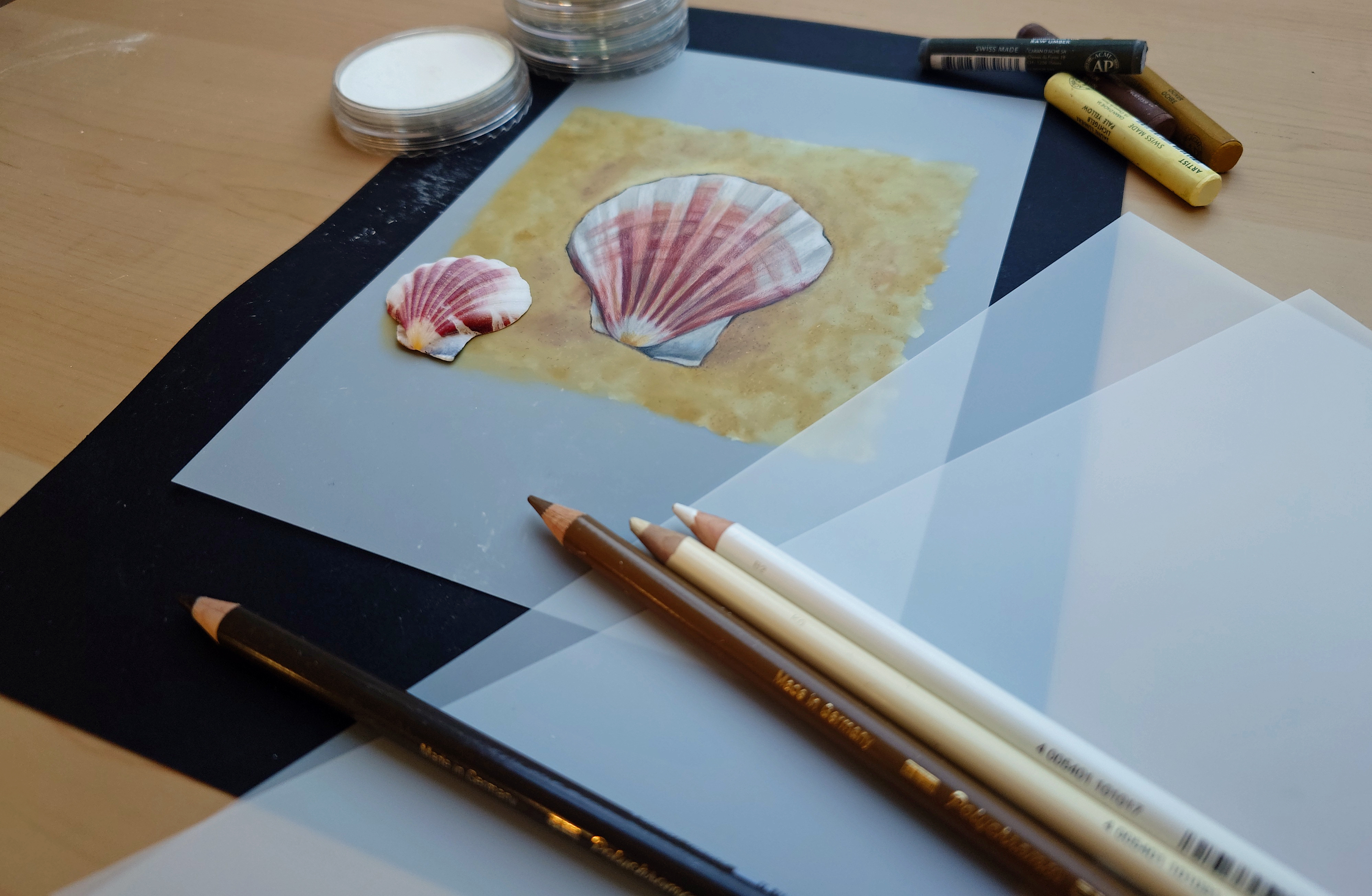 - Polychromos Pencils (White, Ivory, Light Yellow Ochre, Raw Umber, Burnt Umber, Burnt Ochre, India Red, Caput Mortem Violet, Venetian Red, Cinnamon, Warm Grey 1 – 6, Cold Grey 4)