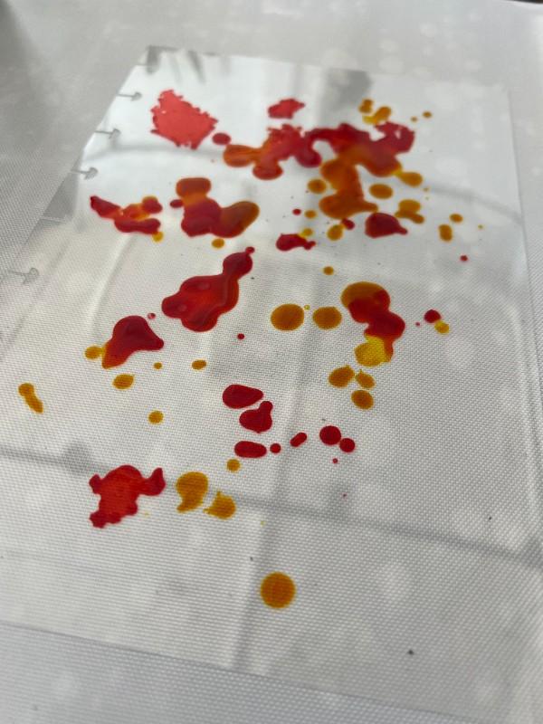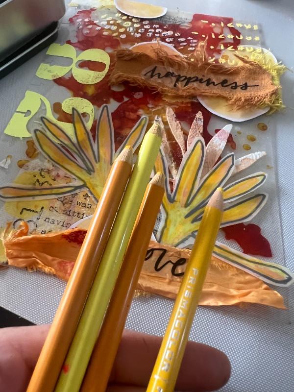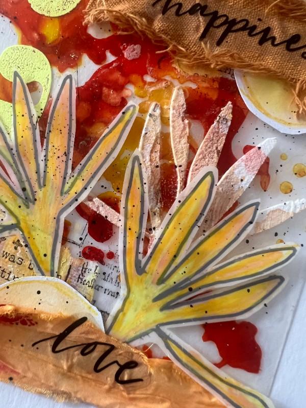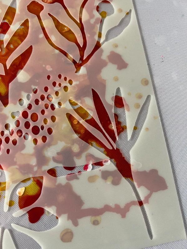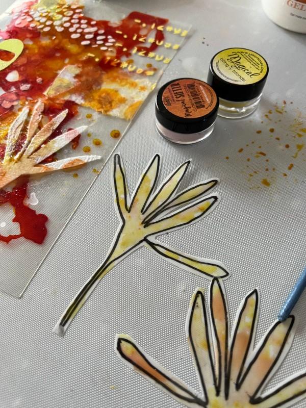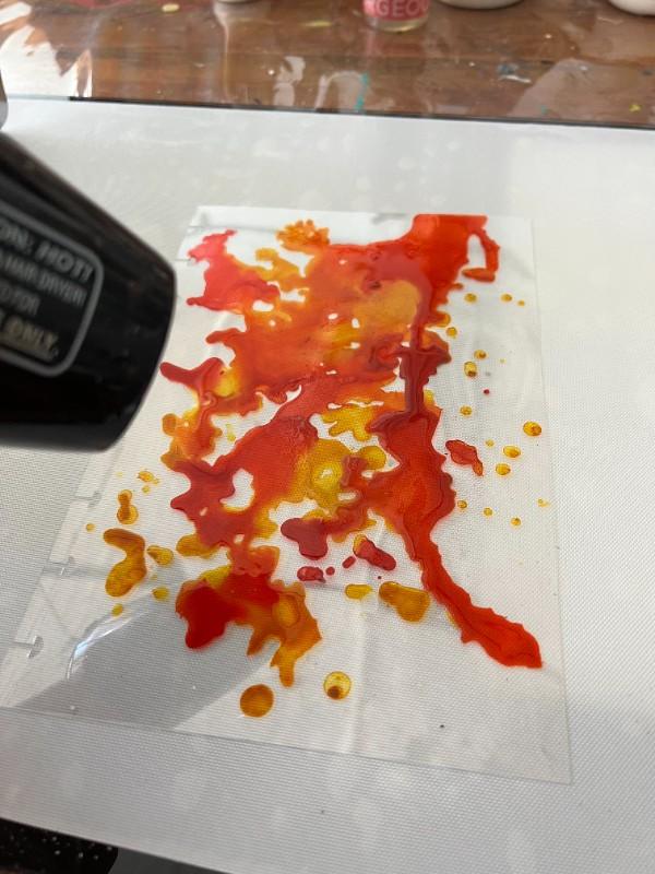 1. On the .010 Clear Dura-Lar sheet, in the assorted Grafix Mixed Media Journal, we started using Ranger alcohol inks, with orange and yellowish tones that evoke Autumn.