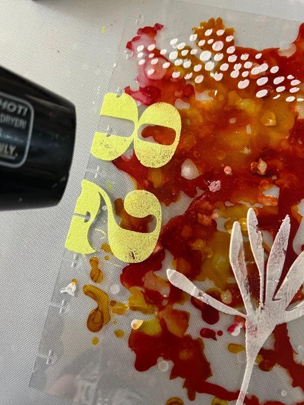 8. On top of the rice paper, once the watercolor is dry, we stamp the same numbers of the rotary stamp as before, but with Distress Oxide Ink in spiced marmalade color.