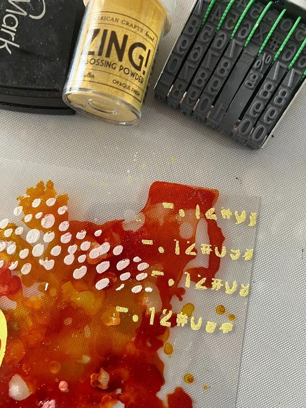 5. Using the same technique, with a rotating number rubber stamp, with the Zing! powders butter color.