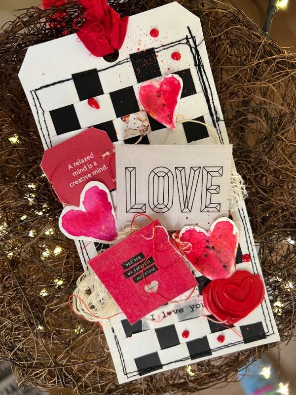 I take some white cotton threads and red sewing thread to put in the background and create a little texture, under the hearts and laminated squares. At the top of the tag, inside the hole I put a Red silk ribbon #sarisdesara.
