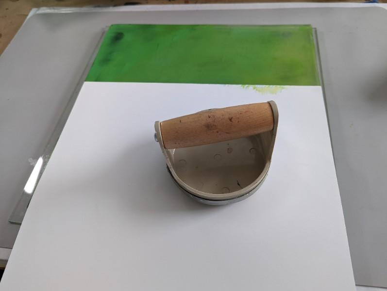 1. Brayer colors onto the Gel Plate. Use stencils, stamps or found objects to create texture into the