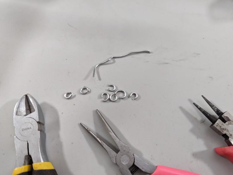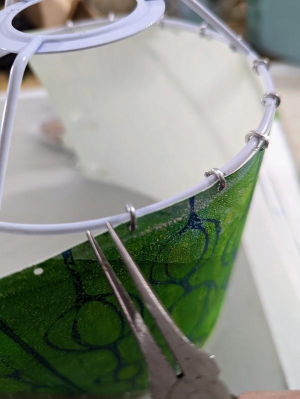 7. Take some wire and create links to attach the shade to the lamp rings. (Show tools used). Alternatively