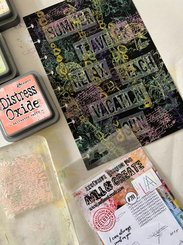 3. I used background stamps from All and Create, and with each background stamp that I have used I have changed the color of distress oxide ink. It has created a background full of colors and depth.