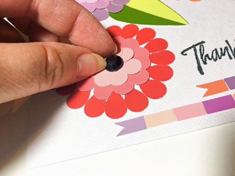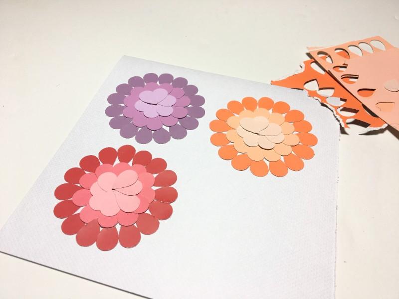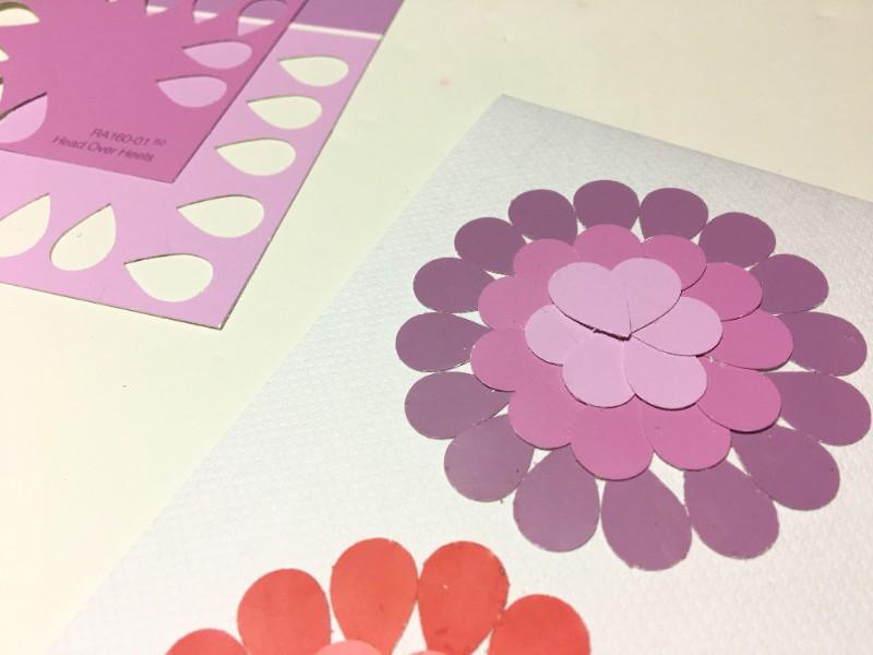 - Punch 10-12 teardrops from a medium pink paint chip, place on adhesive as before, and then adhere teardrops so that they overlap the dark pink circle slightly.