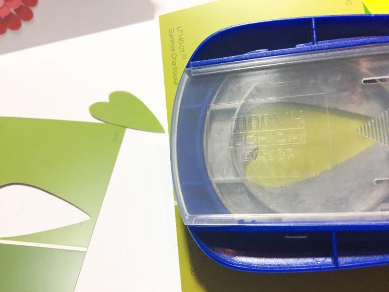 - Punch 2 skinny hearts from medium green and 1 from bright green, dark green, and lime green.