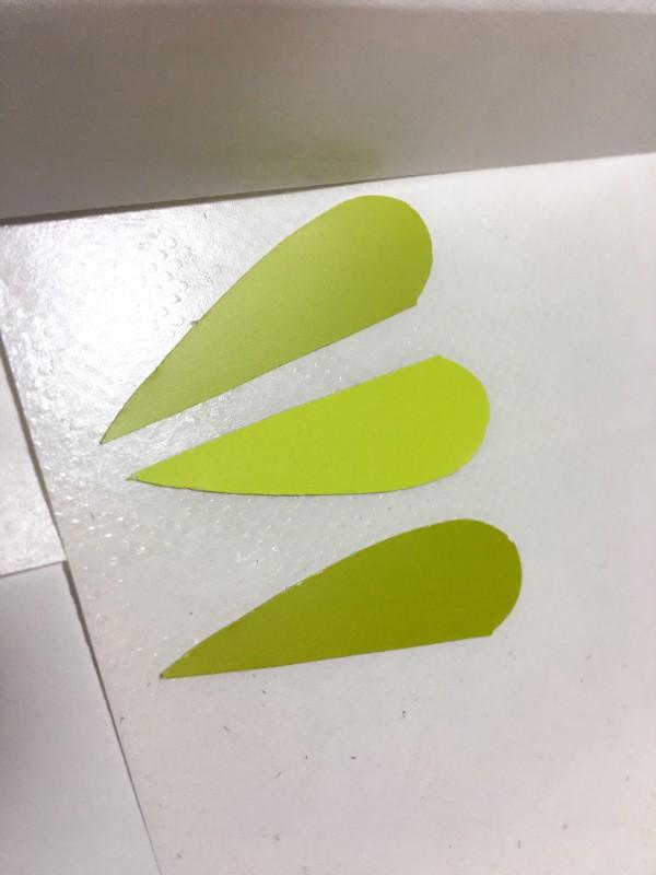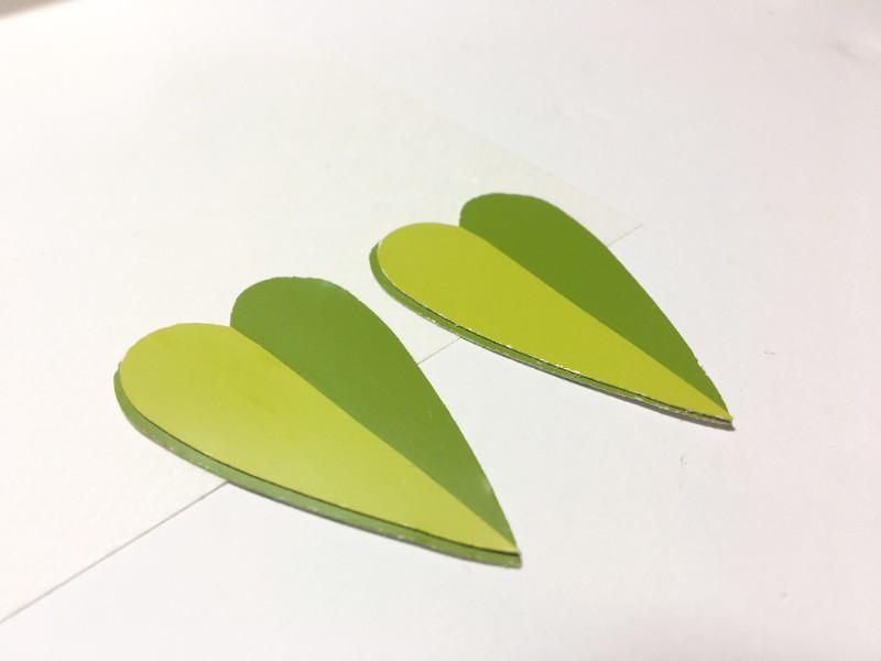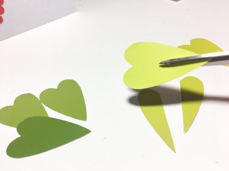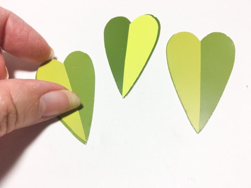 - Cut the bright green and lime green hearts in half, pick 3 to use.